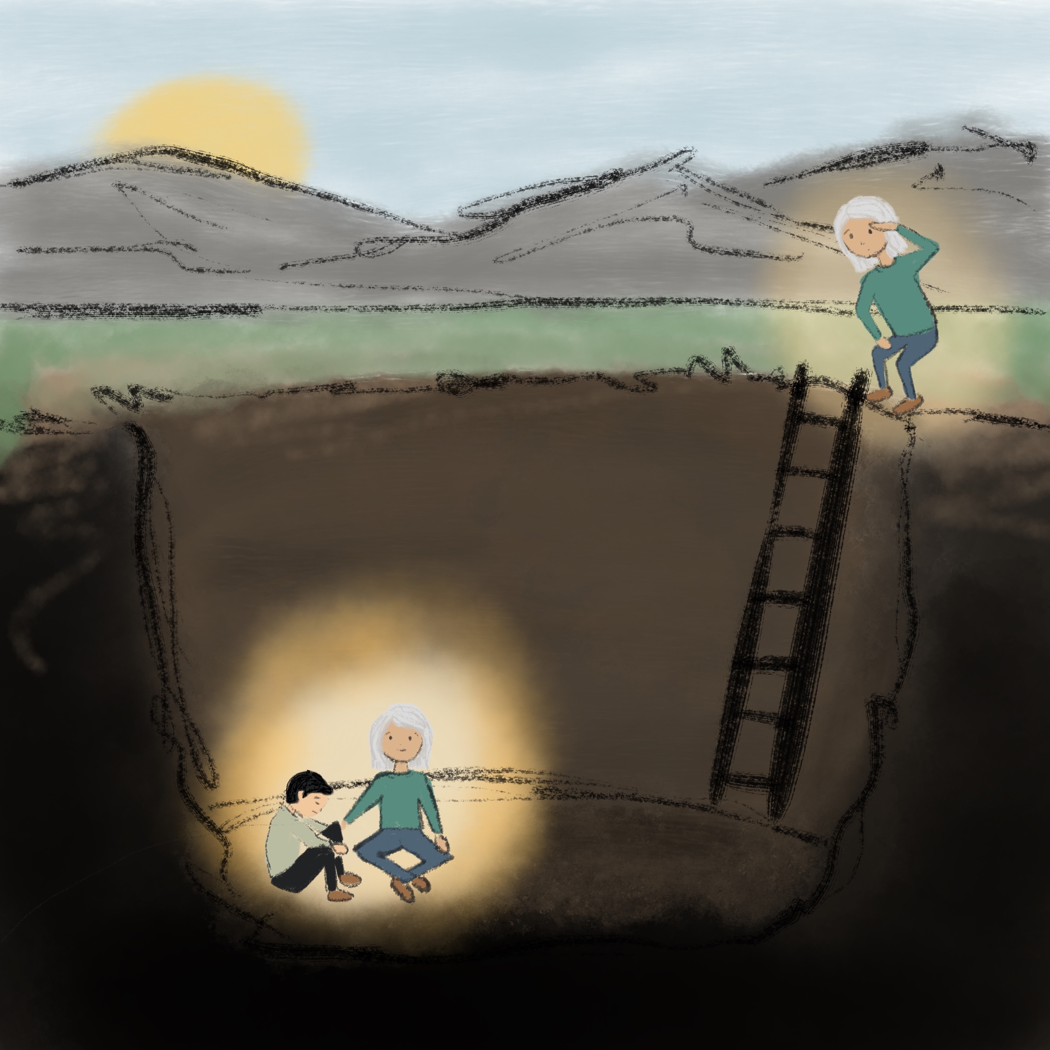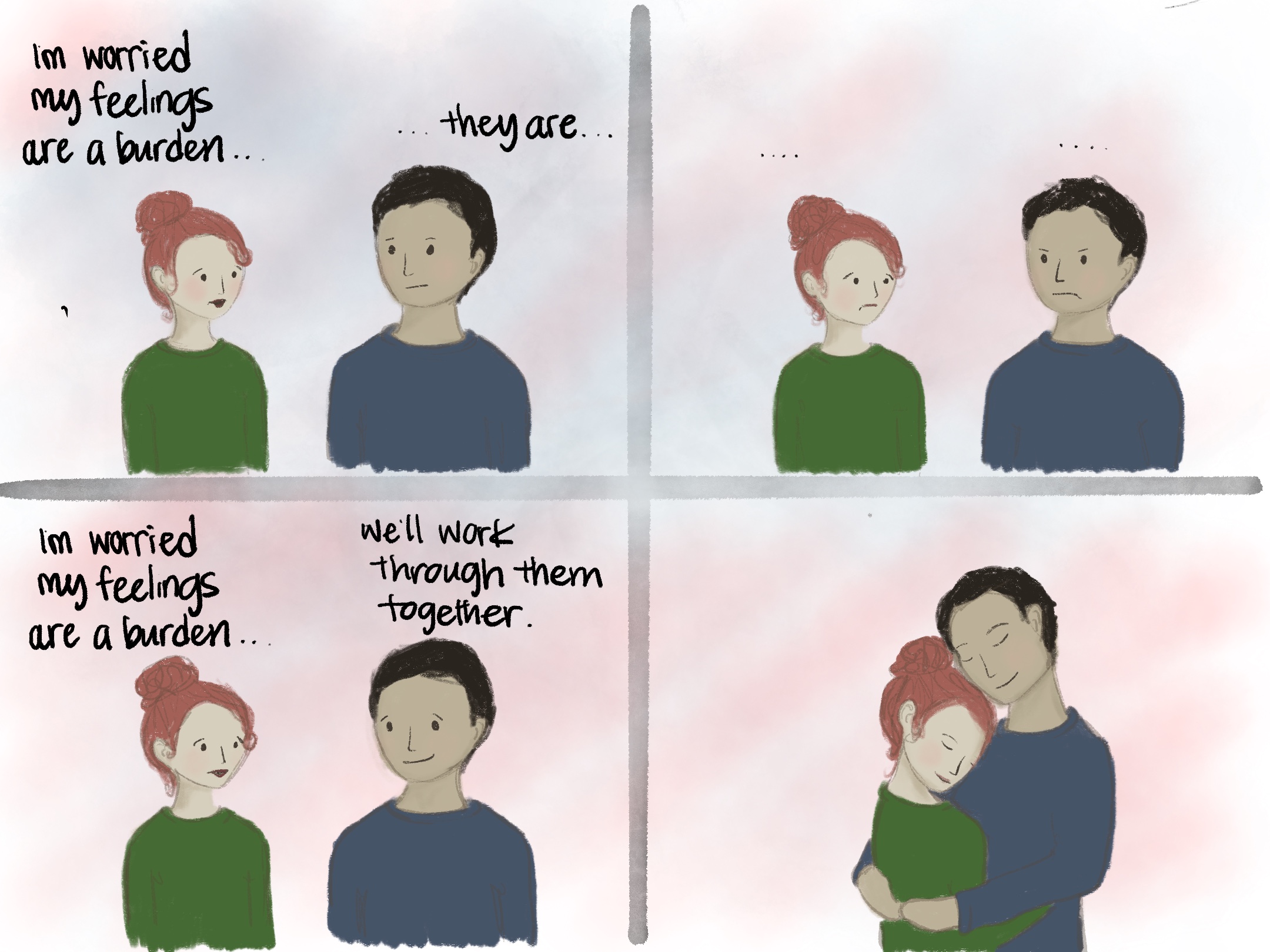 What if, instead, the goal became to make space for even more emotion? Not just yours, but also mine, and the new ones that are created from the mixture of the two? So when my partner has a big emotion, my focus shifts from how to fix it, or help, or make it better, to simply how to make space for them to be who they are. There are a thousand barriers to this approach. I might take it personally. I might have my own strong emotional reaction that I don’t want to talk about, so I try to dismiss theirs to get rid of mine. I might legitimately believe I know the way for them to feel better. Each of these barriers, and more, is what the illustrations will be about.